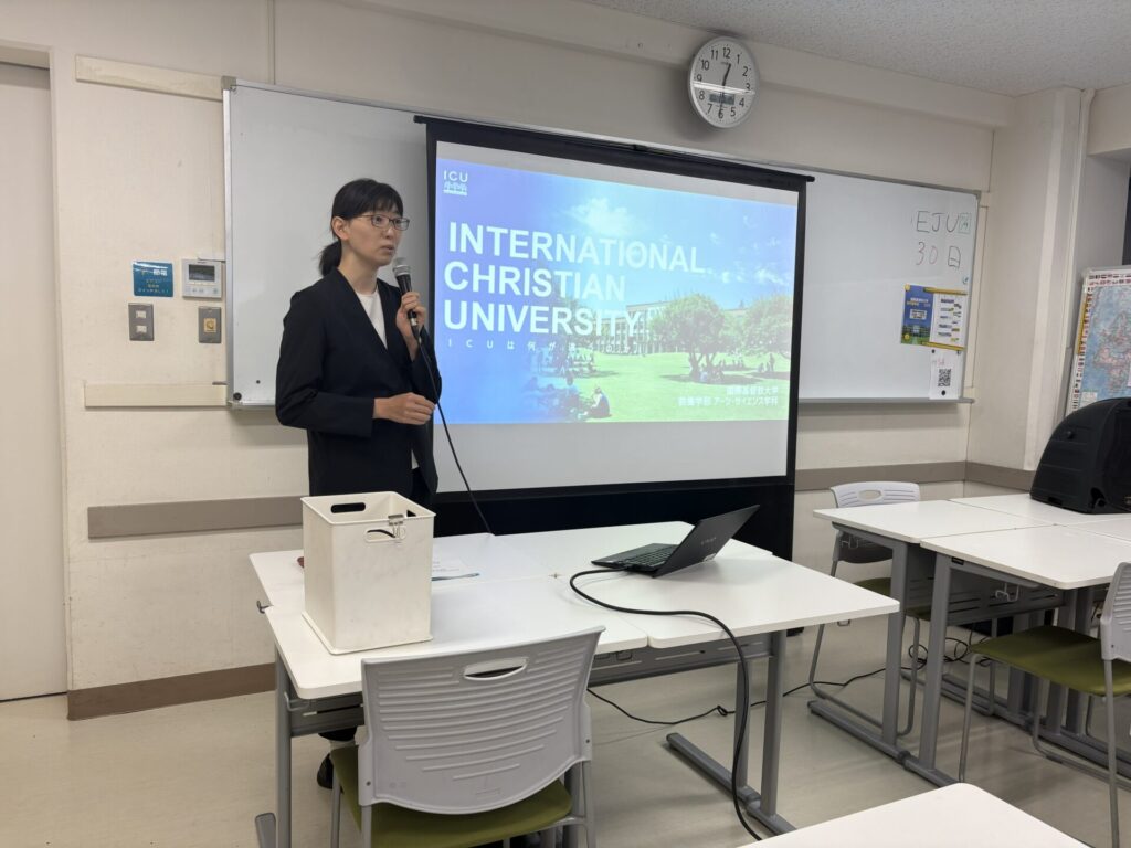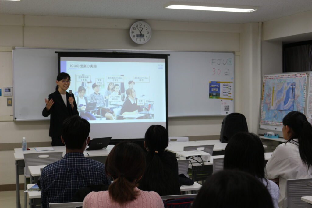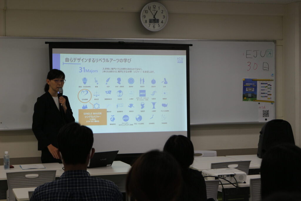 大学説明会では入試担当(パブリックリレーションズ・オフィス)の方にお越しいただき、国際基督教大学の建学の歴史について、キャンパスライフについて、大学入試の方法や学生寮などについてお話を頂きました。